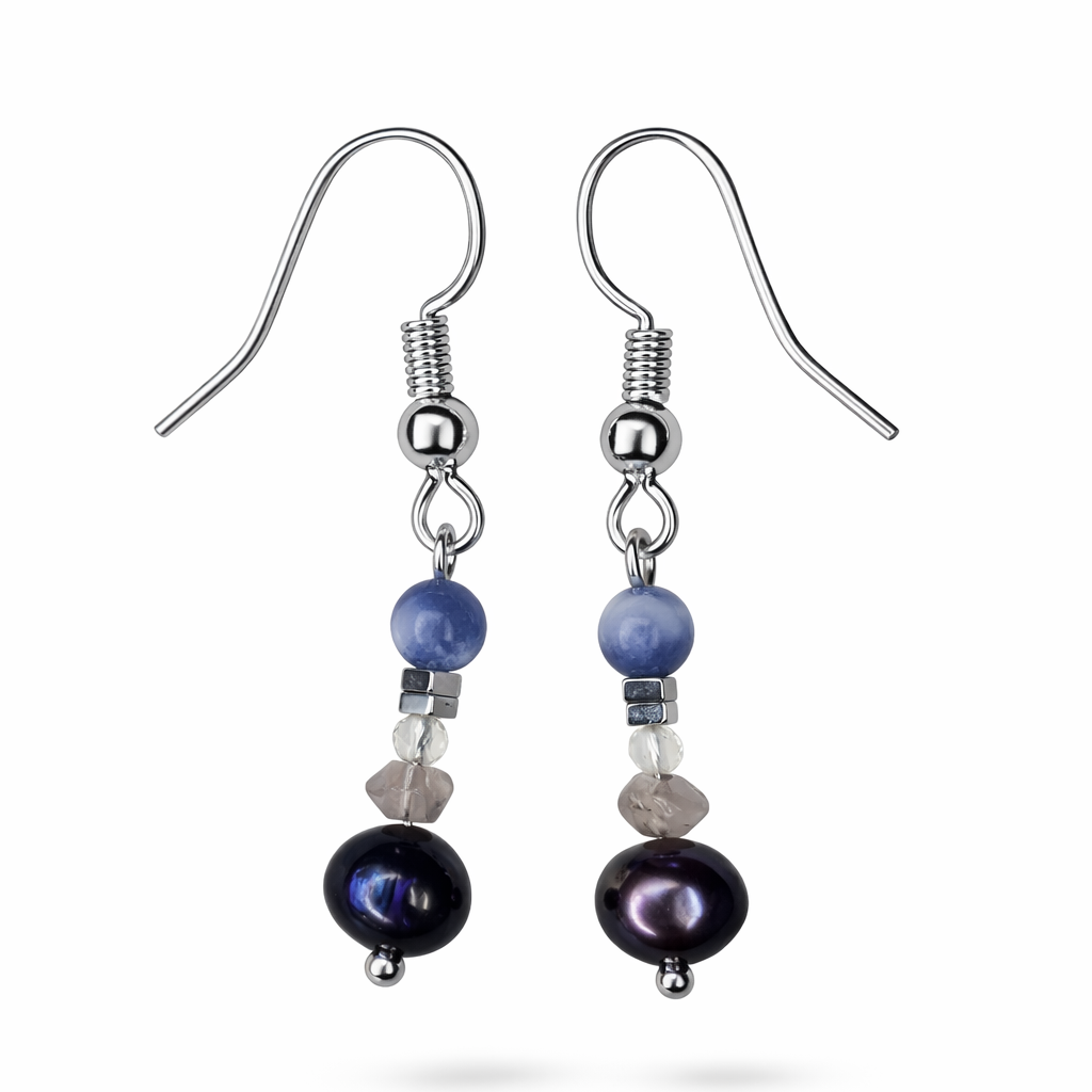 Diese handgefertigten Ohrringe vereinen die schimmernde Eleganz blauer Süßwasserperlen mit der geheimnisvollen Tiefe von Amethyst und Sodalith. Hämatit ergänzt das Design mit einer klaren, modernen Stärke.