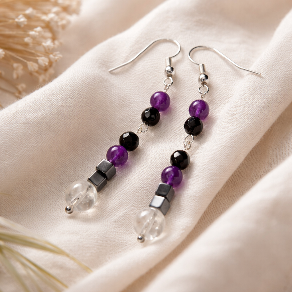 Diese handgefertigten Ohrringe vereinen die klare Strahlkraft des Bergkristalls mit der mystischen Tiefe des Amethysts, der kraftvollen Eleganz des Onyx und der markanten Präsenz des Hämatits.