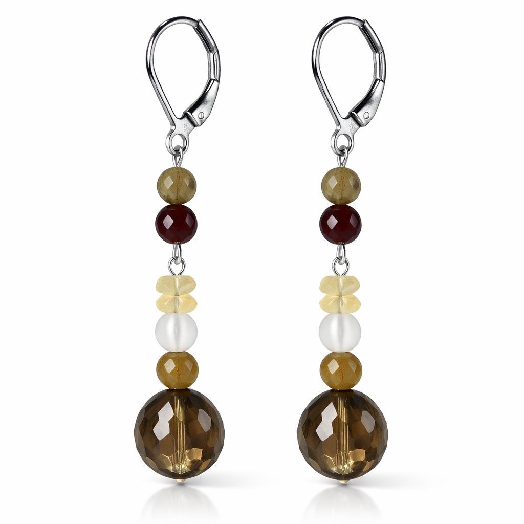 Diese handgefertigten Ohrringe vereinen die erdende Tiefe des Rauchquarzes mit der strahlenden Leichtigkeit des Citrins, dem mystischen Schimmer des Labradorits, der klaren Energie des Bergkristalls und der vitalen Stärke des Granats.