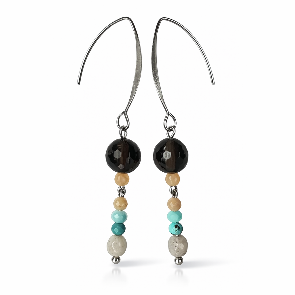 Diese handgefertigten Edelstein-Perlenohrringe vereinen die erdende Tiefe des Rauchquarzes mit dem sanften Schimmer des Mondsteins, der schützenden Mystik des Labradorits, der ruhigen Klarheit des Amazonits und der kraftvollen Frische des Türkis.