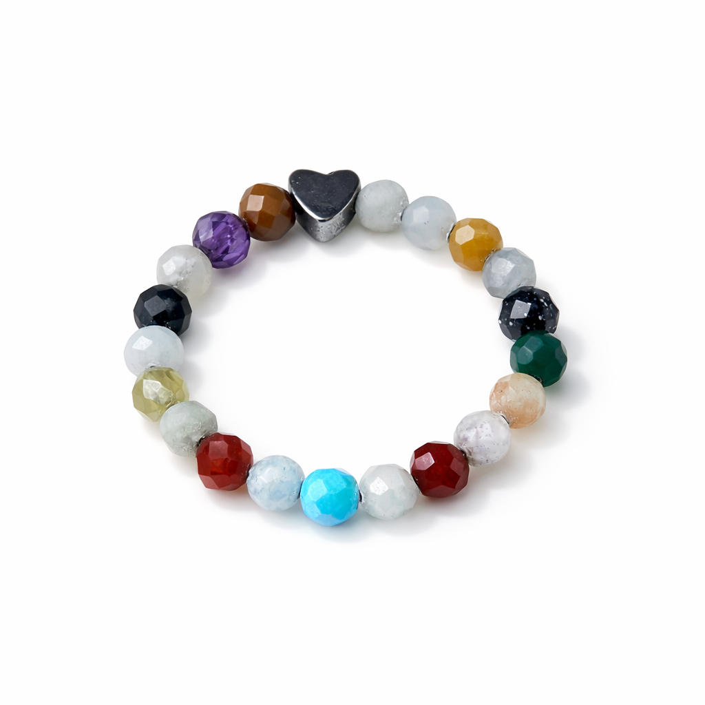 Im Mittelpunkt steht ein kleines Hämatit-Herz, das für Erdung, Schutz und innere Stärke steht.