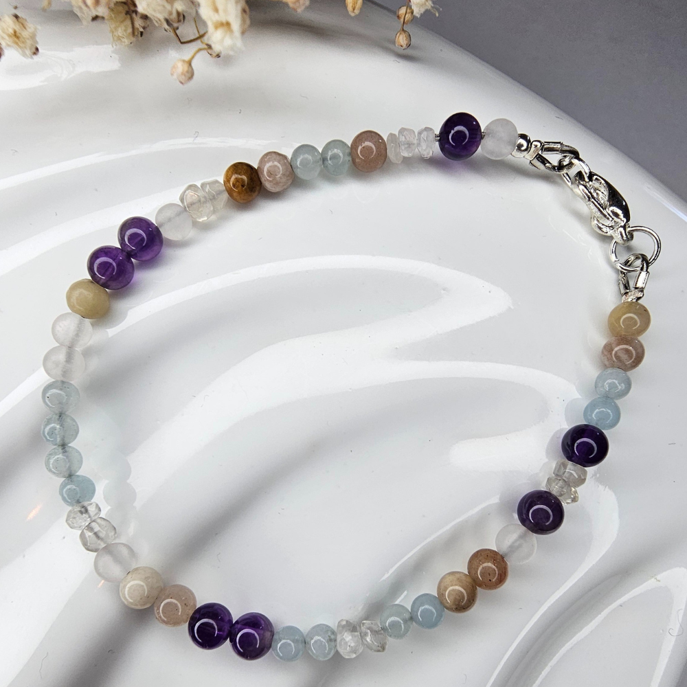 Dieses handgefertigte Edelstein Armband vereint die beruhigende Klarheit des Aquamarins, die spirituelle Tiefe des Amethysts, die intuitive Kraft des Mondsteins, die liebevolle Sanftheit des Rosenquarzes und die reine Energie des Bergkristalls. Gemeinsam entfalten diese Edelsteine ein harmonisches Zusammenspiel aus Ruhe, Inspiration und innerer Balance.