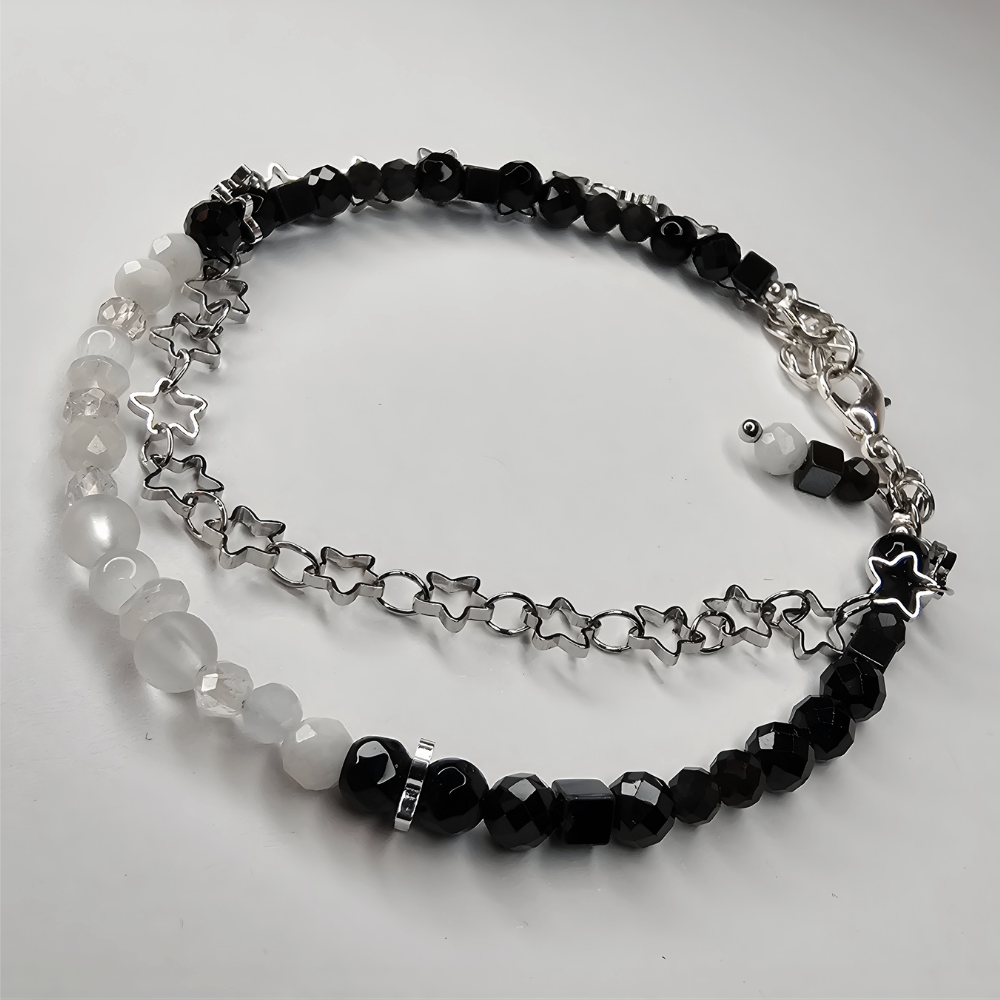 Dieses handgefertigte Edelsteinarmband vereint die schützende Tiefe des Obsidians, die kraftvolle Stärke des Onyx, die intuitive Sanftheit des Mondsteins, den schimmernden Zauber des Opals und die klare Reinheit des Bergkristalls. Gemeinsam entfalten diese Edelsteine ein ausgleichendes Zusammenspiel aus Schutz, Licht und innerer Klarheit – ein Begleiter, der Ruhe, Stärke und feine Energie in deinen Alltag bringt.