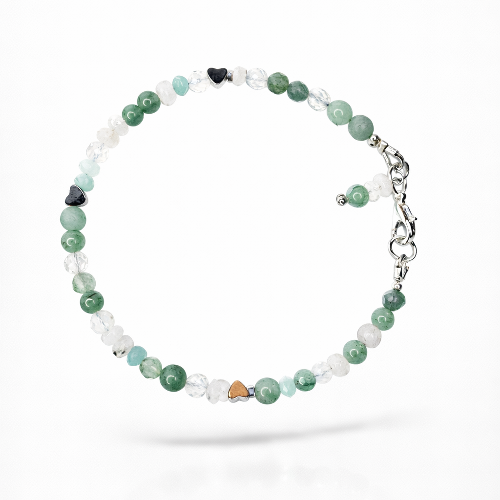 Dieses handgefertigte Edelsteinarmband vereint die harmonisierende Ruhe des Aventurins, die sanfte Ausgeglichenheit des Amazonits, die intuitive Kraft des Mondsteins, die schützende Erdung des Hämatits und den feinen Schimmer des Opals. Aventurin und Amazonit fördern Gelassenheit und emotionale Klarheit, Mondstein stärkt Intuition, Hämatit erdet und schützt, während Opal dem Armband eine lichte, inspirierende Note verleiht.