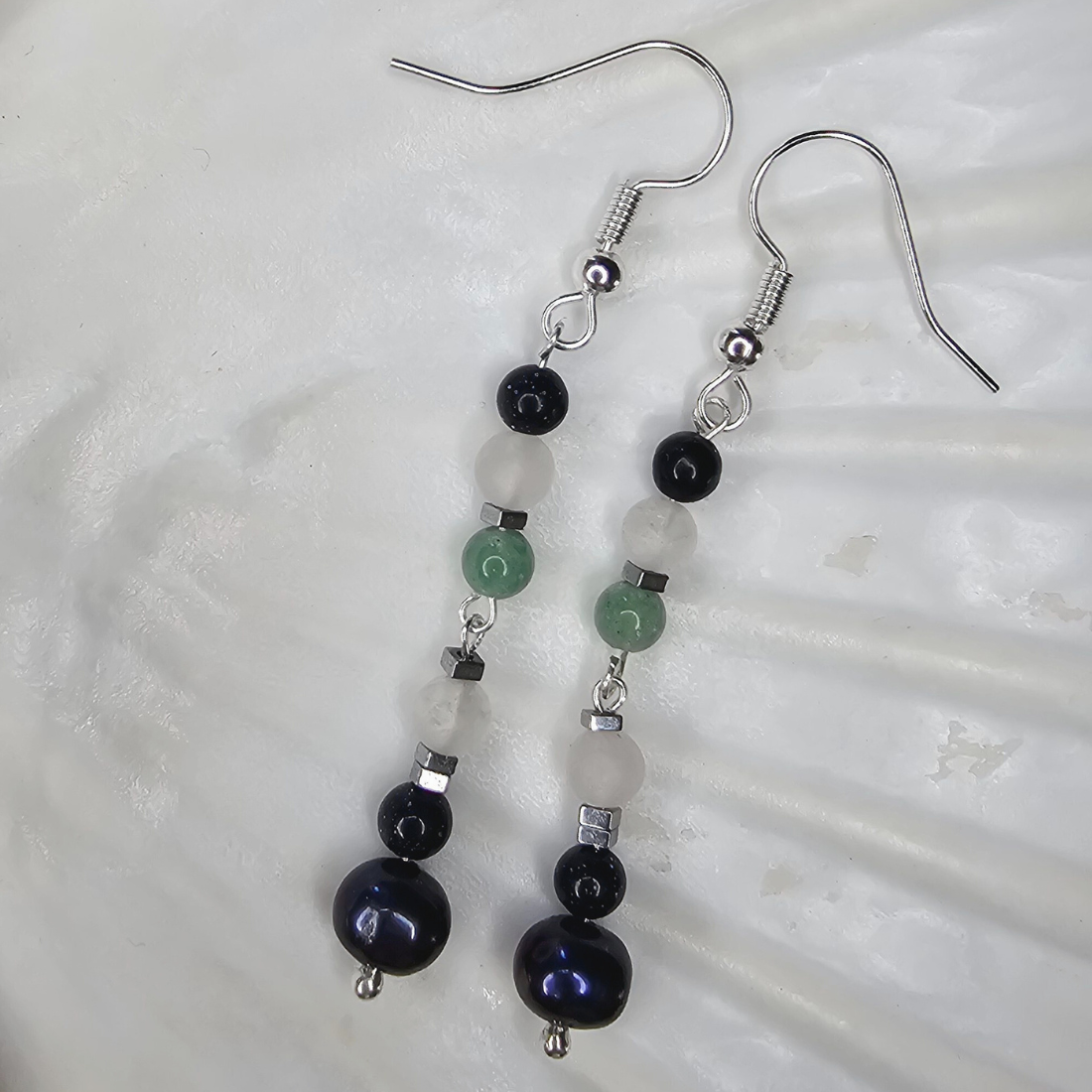 Diese handgefertigten Ohrringe vereinen den schimmernden Glanz blauer Süßwasserperlen mit der funkelnden Tiefe von Blaufluss. Hämatit bringt stabile Erdung, Aventurin sanfte Harmonie und Rosenquarz eine liebevolle, herzöffnende Note in das Design.