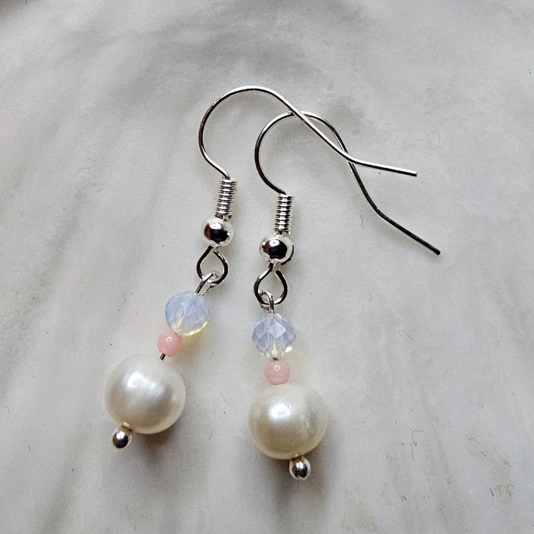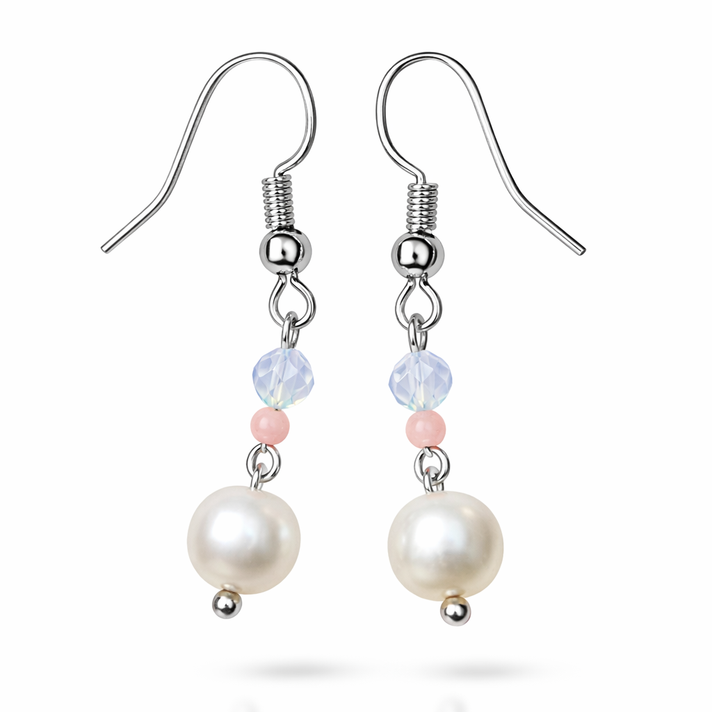 Diese handgefertigten Ohrringe vereinen die zeitlose Eleganz weißer Süßwasserperlen mit dem sanften Schimmer von Opalit. Ein Akzent aus Bambuskoralle bringt lebendige Farbe und eine warme, frische Ausstrahlung in das Design.