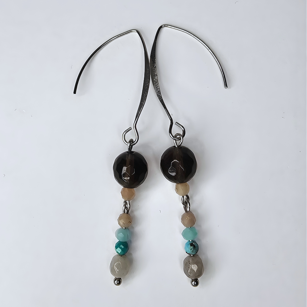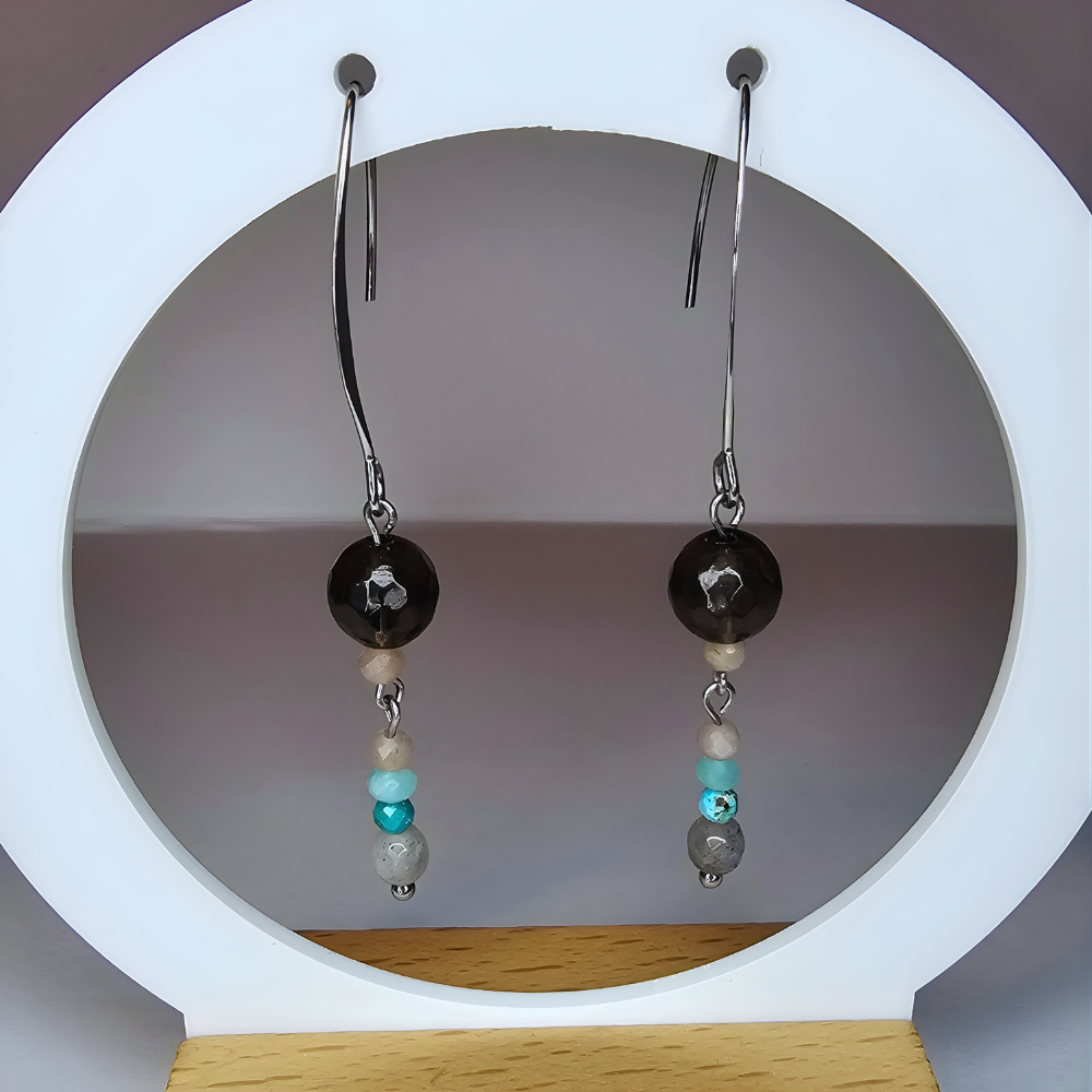 Diese handgefertigten Edelstein-Perlenohrringe verbinden die erdende Tiefe des Rauchquarzes, den sanften, intuitiven Schimmer des Mondsteins, die mystisch-schützende Aura des Labradorits, die beruhigende Klarheit des Amazonits und die kraftvolle, mutspendende Energie des Türkis.
