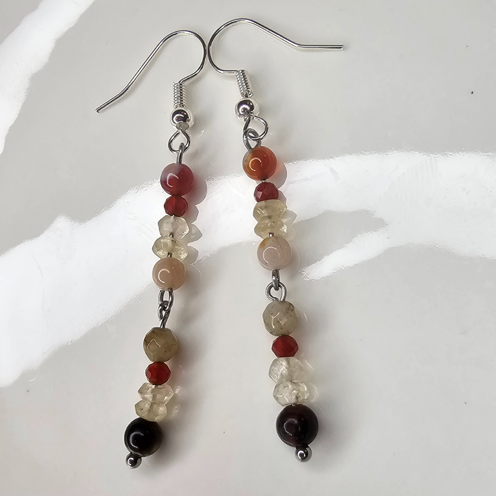 Diese handgefertigten Ohrringe vereinen die leuchtende Energie des Citrins, die schützende Kraft des Tigerauges, die vitale Wärme des Carneols, die leidenschaftliche Ausstrahlung der Bambuskoralle und den sanften Glanz des Labradorits.