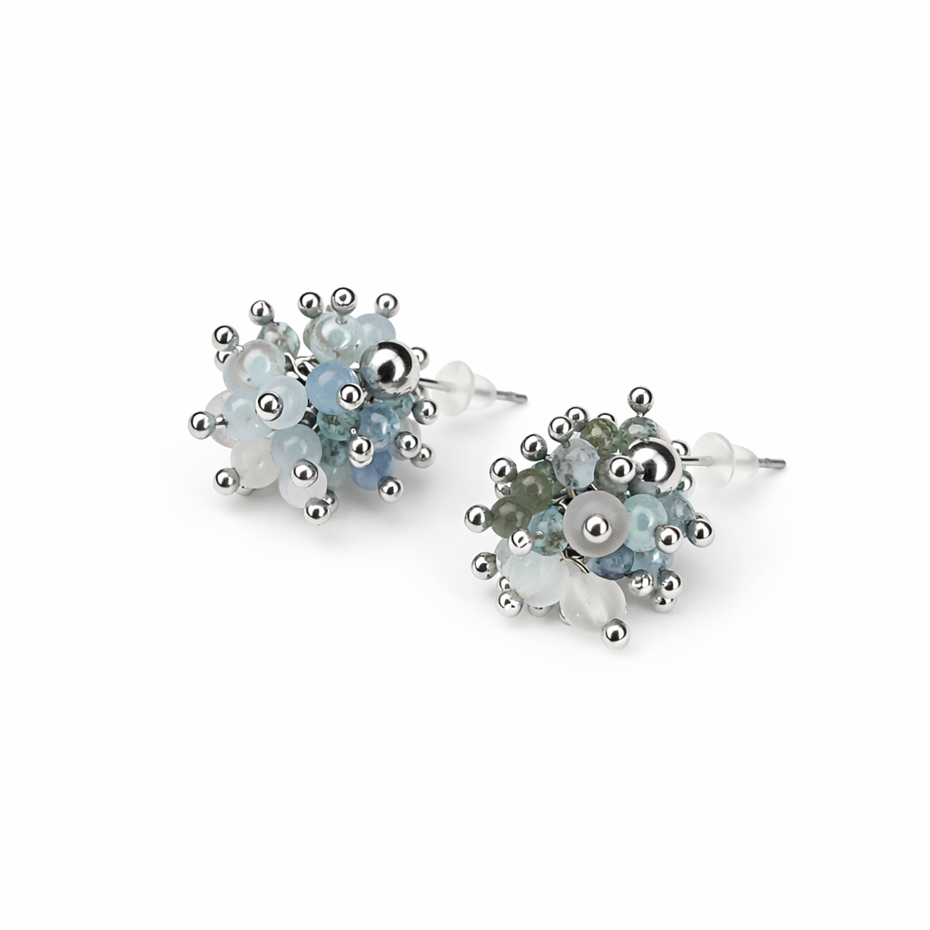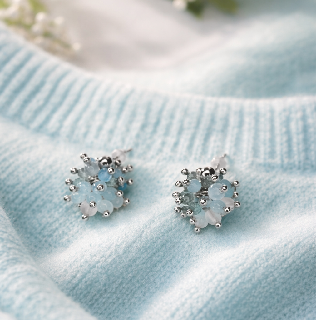 Zarte, handgefertigte Cluster-Ohrringe aus Aquamarin, Bergkristall und Apatit – ein feiner Energiemix für Klarheit, Leichtigkeit und neuen Fokus.