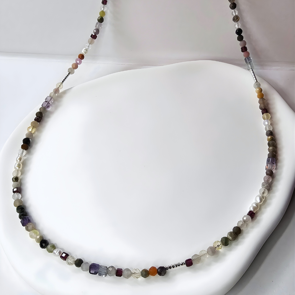 Dieses handgefertigte 2-in-1-Schmuckstück vereint Klarheit, Schutz und sanfte Herzenergie in einem fein schimmernden Edelsteinmix. Fluorit bringt Fokus und innere Ordnung, während Mondstein Intuition und emotionale Balance stärkt. Granat schenkt Mut und Kraft, Alashan Achat wirkt beruhigend und stabilisierend, und Turmalin unterstützt dich dabei, dich energetisch abzugrenzen. Citrin bringt Licht, Optimismus und Lebensfreude, Opal verleiht Leichtigkeit und feine Sensibilität. Zarte Süßwasserperlen runden das Design mit zeitloser Eleganz ab.